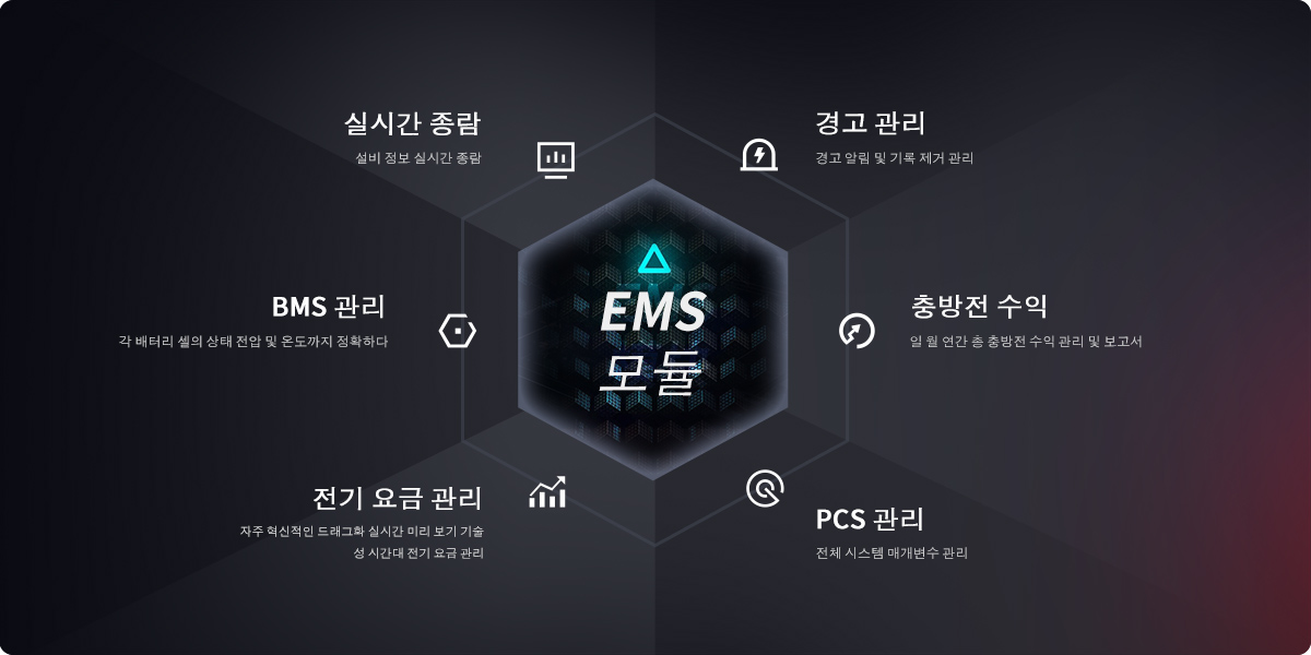 설비 정보 실시간 종람, 매개변수 제어 초급 하달, 경고 통지 및 제거 기록 관리, 비용 보고서 통계, 과거 데이터의 정확한 조회, 자주 혁신적인 드래그화 실시간 미리 보기 기술 성 시간대 전기 요금 관리, PCS 전체 시스템 매개변수 관리, BMS 관리는 각 배터리 셀의 상태 전압 및 온도까지 정확하고, 일 월 연간 총 충방전 수익 관리 및 보고서, 에너지 저장 캐비닛 소화 소방 모듈 제어, 에어컨 전기 미터의 정확한 계량 제어, 세입자 모드를 보유하고, 여러 하위 에이전트 서브 계정 관리, 구축이 가능하며 하위 계정 EMS 발전소 생성이 가능하다.