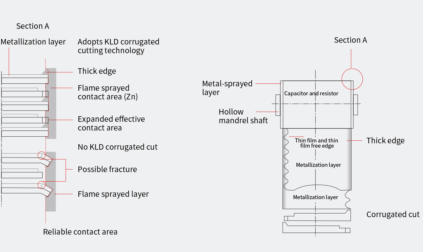 Capacitor adopts film edge thickening reinforcement technology, which can enhance the reliable connection between the gold-sprayed surface and the electrode. The internal film uses both corrugated and smooth cutting methods, which maximizes the effective surface between the component and the metallization layer and improves surge current suppression capability.