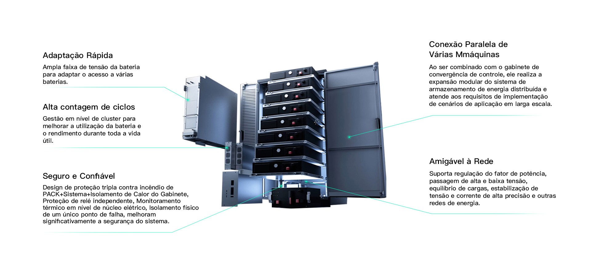 O armazenamento de energia distribuído com Conexão Paralela de Várias Mmáquinas pode atender às necessidades de usinas de armazenamento de energia em escala de trilião-watts. Os sistemas em cadeia são mais eficientes e seguros, e custam menos para serem implantados em campo.