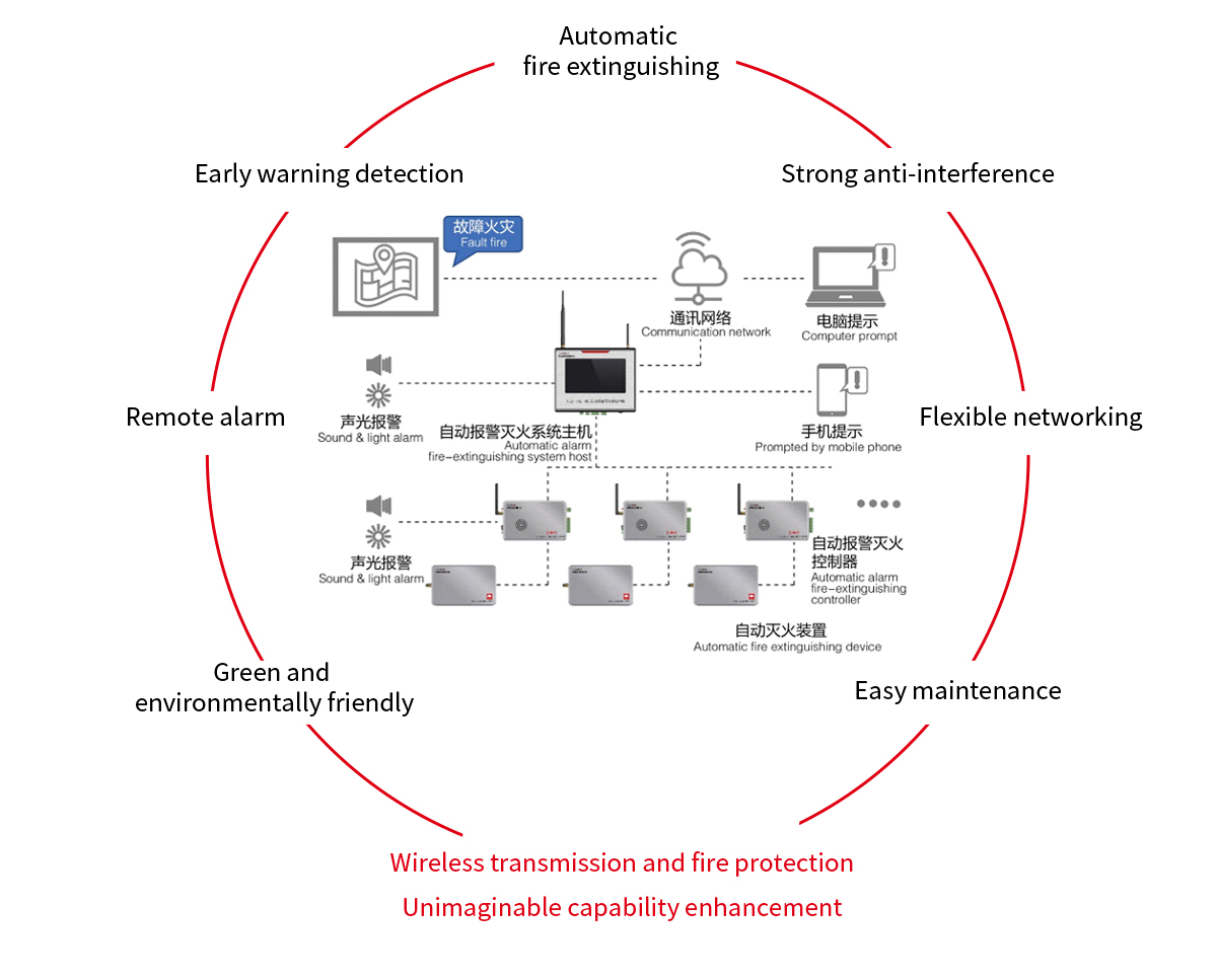 系统通过分布安装的远程传感模块,快速监测周围环境变化情况,一旦发现火灾,系统会快速利用无线通讯发出报警信号,提示火灾位置与发生时间,在远程通讯火警状况的同时,自动灭火,确保第一时间起到消防灭火的目的。
