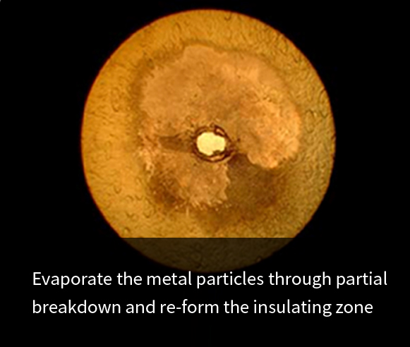 电容器绕组介质采用渐变式金属化聚丙烯薄膜,通过局部击穿,蒸发金属颗粒,重新形成绝缘区,使电容器自我隔离故障点,继续正常工作,达到自愈功能。同时因击穿导致的容量损失极少,可忽略不计,不影响电容器的正常使用。